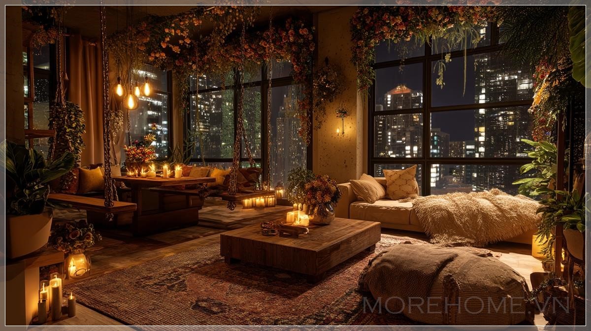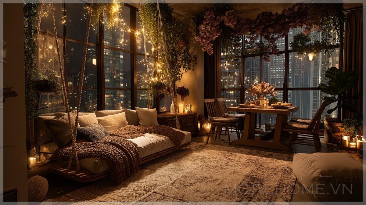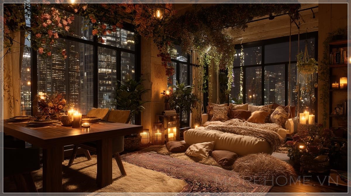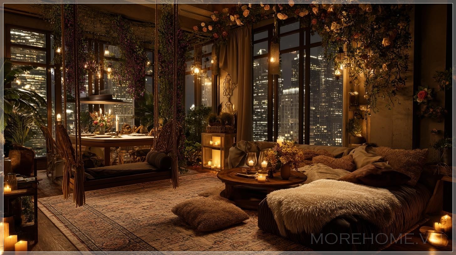 Một không gian phòng khách ấm cúng và dễ chịu của ba ma cà rồng, nằm ở trung tâm Chicago vào ban đêm. Phòng được trang trí với nhiều hoa, tạo cảm giác tươi mới và sống động. Góc phòng có một chiếc ghế bành bọc nệm mềm mại, với những chiếc chăn lông mịn và những chiếc gối êm ái, tạo nên không gian thư giãn tuyệt vời. Bàn ăn nằm trên một tấm thảm shaggy, xung quanh là những chiếc ghế đơn giản nhưng đầy đủ sự tinh tế. Phòng còn có một chiếc xích đu nhỏ, góp phần tạo nên một không gian vừa ấm áp vừa độc đáo. Ánh sáng nhẹ nhàng từ các đèn chiếu, cùng không gian yên tĩnh của thành phố Chicago về đêm, mang lại một không khí vừa lạ lẫm vừa quen thuộc cho ba ma cà rồng đang sống trong ngôi nhà này.