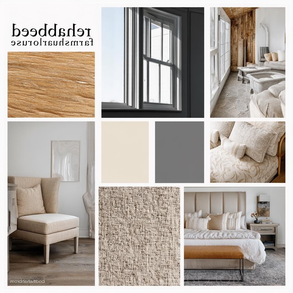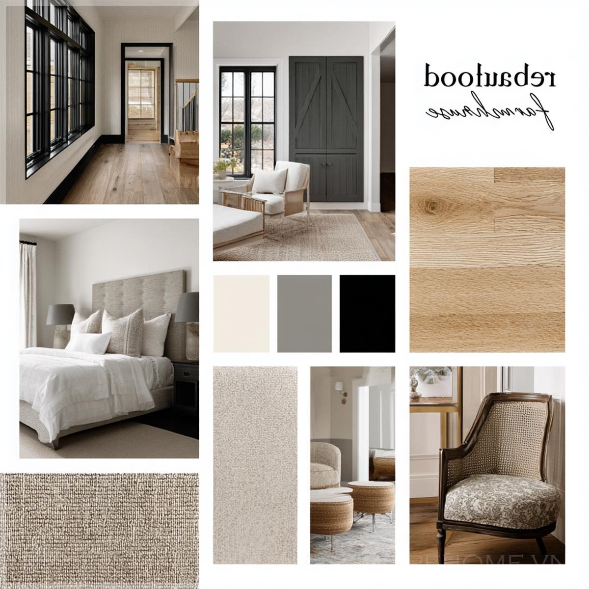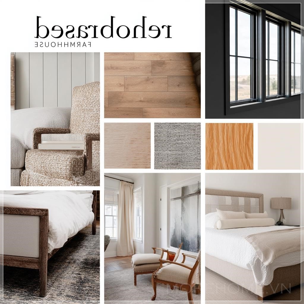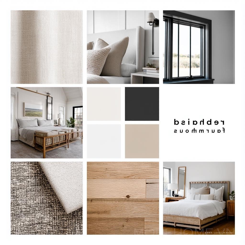 Bảng moodboard thiết kế nội thất cho ngôi nhà cải tạo theo phong cách farmhouse với bảng màu đen, trắng và beige. Bao gồm các yếu tố như khung cửa sổ bằng gỗ tối màu, sàn gỗ sồi sáng, giấy dán tường có kết cấu vải trung tính, sơn tường màu trắng ngà, các chi tiết đá sa thạch, tấm đầu giường có hoa văn vải, và thảm kiểu vintage.