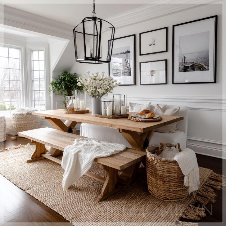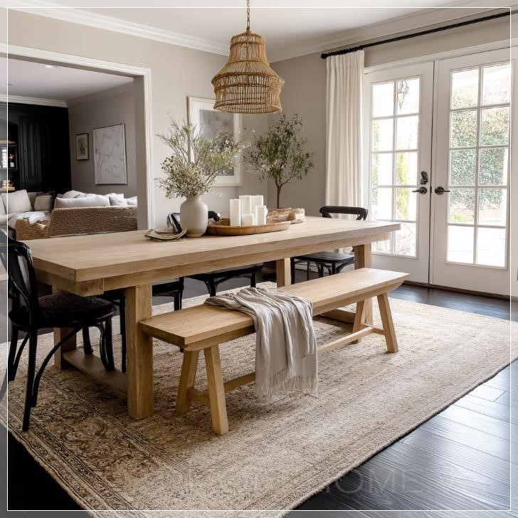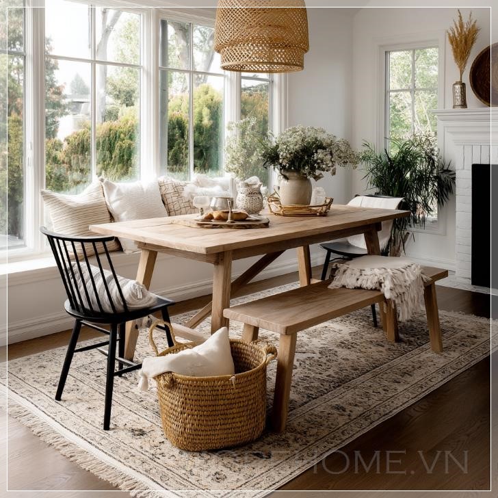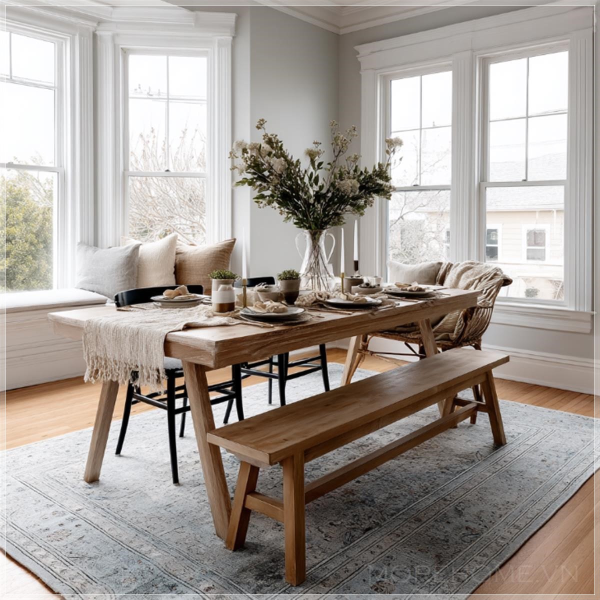 Phòng ăn theo phong cách Serena and Lilly, với một chiếc thảm làm điểm nhấn ở giữa căn phòng, mang đậm ảnh hưởng của phong cách nhà nông hiện đại. Bàn ăn kết hợp với ghế dài, tạo nên không gian ấm cúng và thoải mái. Thảm ở trung tâm là điểm nhấn mạnh mẽ, làm nổi bật thiết kế của toàn bộ không gian. Cảnh quay ở góc giữa, thể hiện sự hài hòa và tinh tế trong thiết kế.