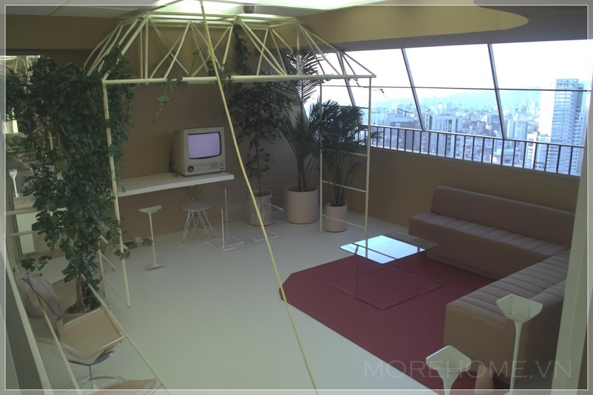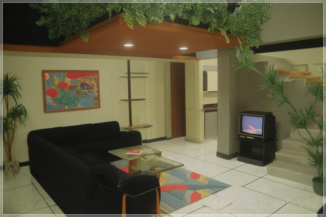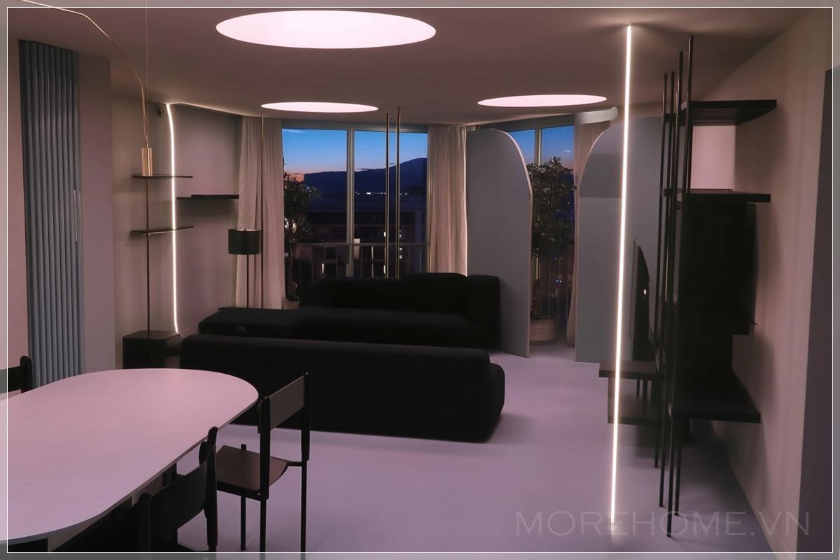 Nội thất căn hộ với không gian mở, tường trắng sáng kết hợp với sàn gỗ màu sáng, tạo cảm giác rộng rãi và thoáng đãng. Phòng khách có một bộ sofa màu xám nhạt, bàn cà phê bằng gỗ tự nhiên, và những chiếc ghế đơn hiện đại. Kệ TV treo tường đơn giản với màn hình LED lớn, tủ kệ âm tường tối giản. Ánh sáng tự nhiên từ cửa sổ lớn chiếu vào, làm nổi bật không gian sống. Decor trang trí như cây xanh và tranh treo tường mang đến sự tươi mới, hài hòa.