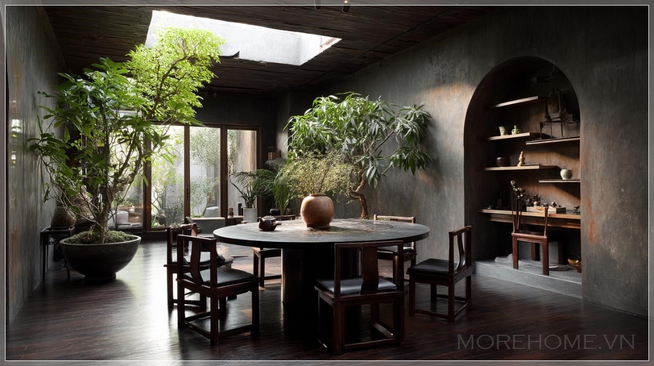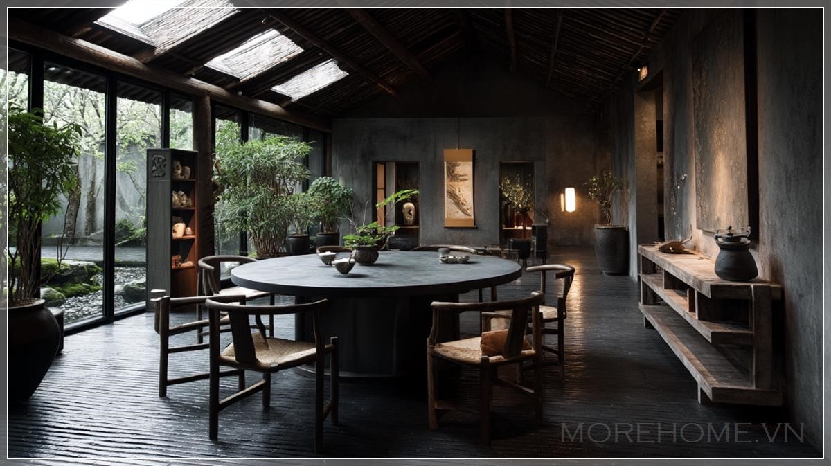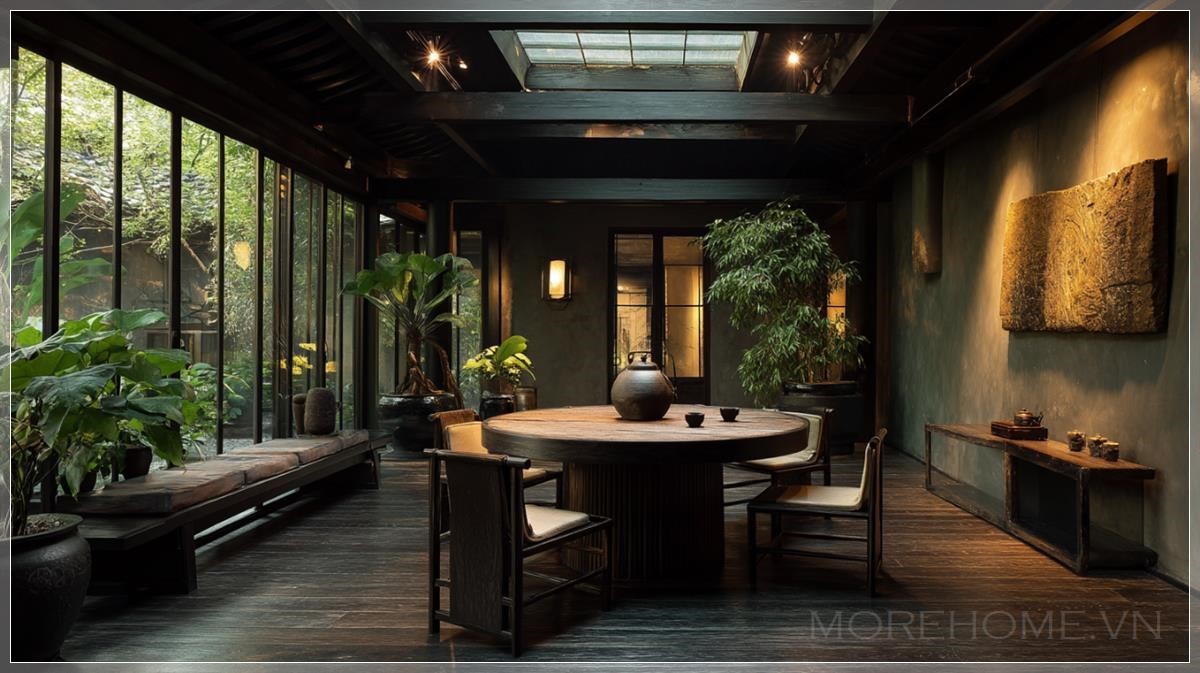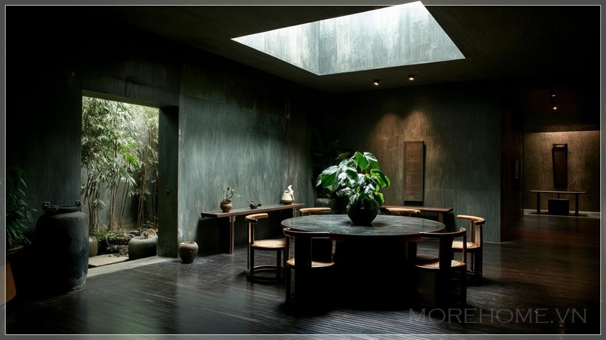 Một không gian phòng riêng phong cách Trung Hoa do Axel Vervoordt thiết kế, góc nhìn từ phía trước, với một bàn ăn tròn lớn và những chiếc ghế được sắp xếp trung tâm của không gian. Bàn được trang trí với những tách trà Trung Hoa, những chậu cây cảnh, và một lọ hoa nhỏ hoặc tách trà trên kệ, mang lại nét quyến rũ nghệ thuật cho căn phòng. Những bức tường và trần nhà phủ lớp đất, tạo cảm giác gần gũi với thiên nhiên. Sàn gỗ tối màu tạo nên sự ấm áp, ánh sáng ban đêm nhẹ nhàng làm nổi bật không gian. Vườn ngoài trời mang đến ánh sáng tự nhiên qua các cửa sổ trần, hòa quyện với không khí thư giãn. Phong cách Wabi-Sabi thể hiện sự giản dị và tinh tế, không gian ngập tràn sự thanh thoát, nhẹ nhàng. Ánh sáng môi trường mềm mại tạo ra một không gian thoải mái, tinh tế, hoàn hảo cho những phút giây thư giãn.