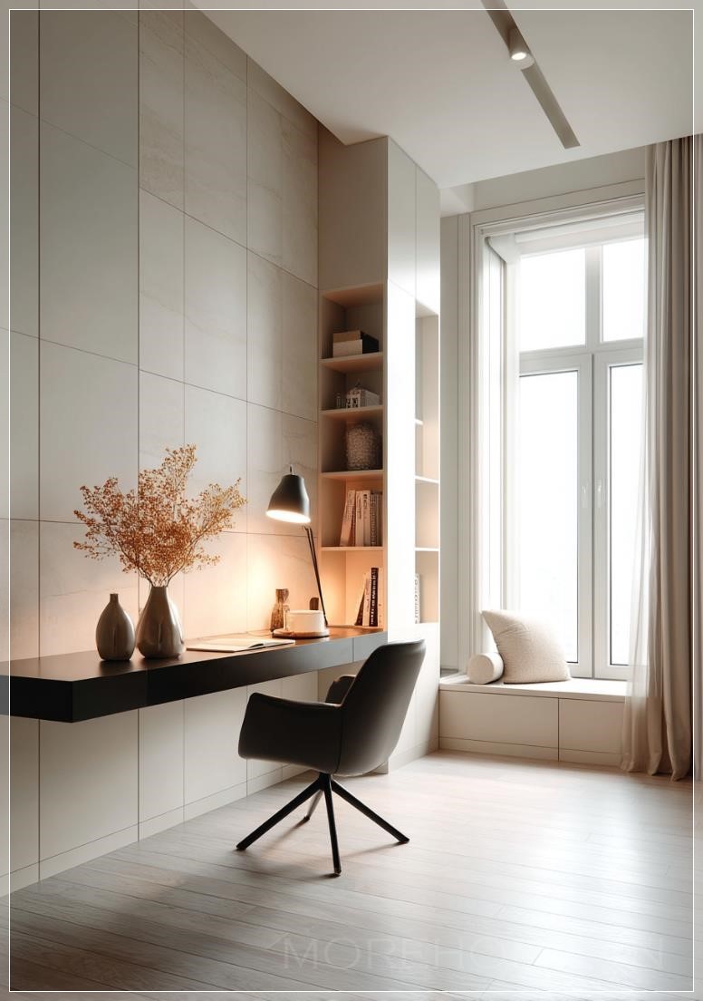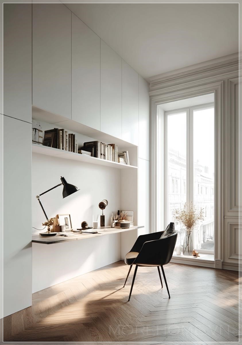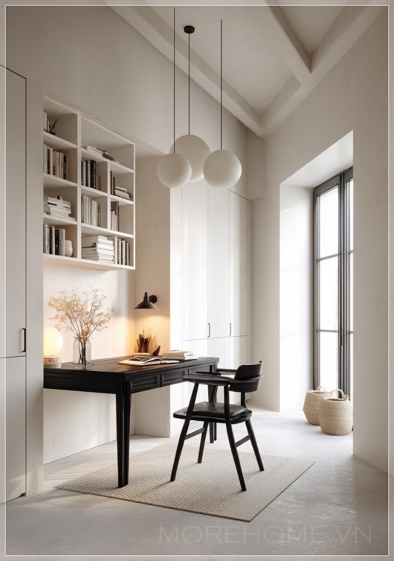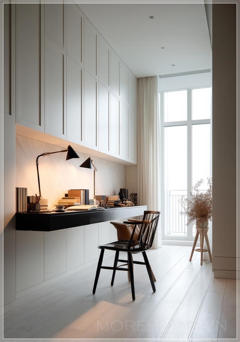 Thiết kế nội thất tối giản của một căn hộ với chiếc bàn làm việc màu đen tinh tế, tủ và tường màu trắng, ánh sáng nhẹ nhàng từ những chiếc đèn hiện đại tạo ra không gian ấm cúng. Phòng có nội thất tối giản với những đường nét sạch sẽ, tạo không gian thoải mái cho công việc hoặc học tập vào buổi tối.