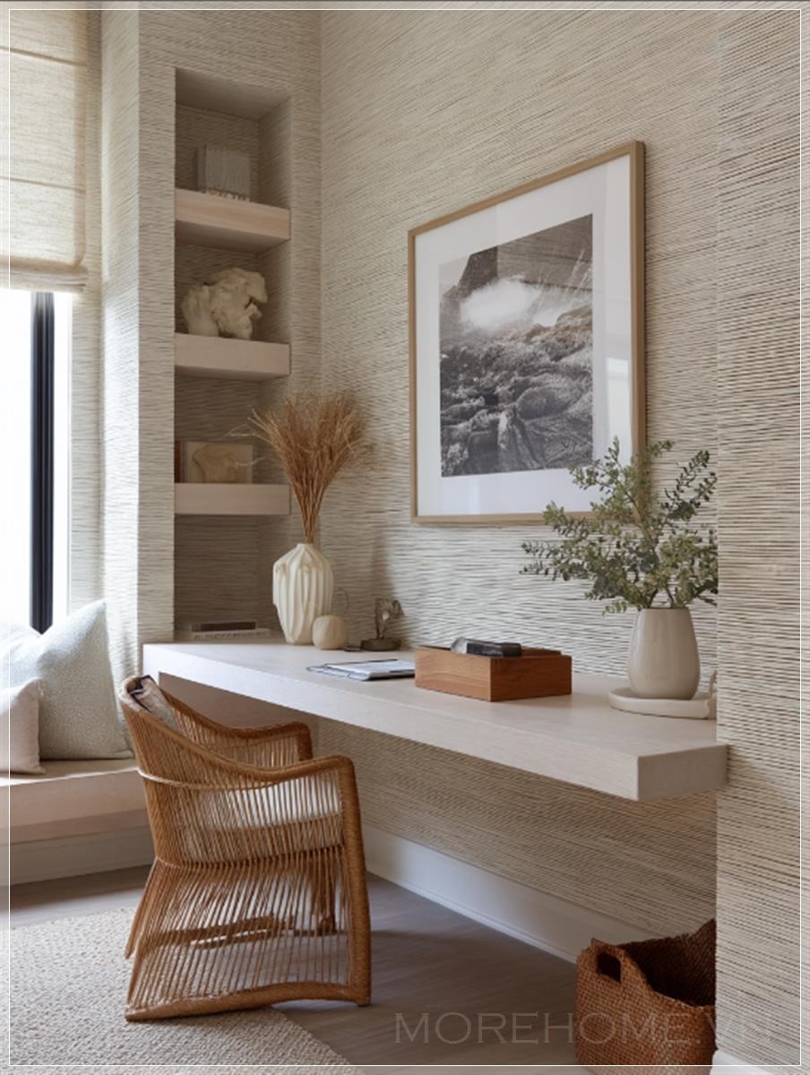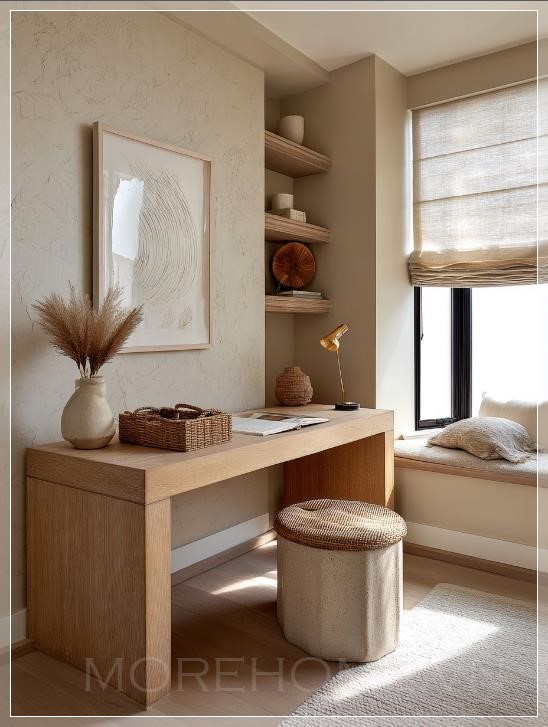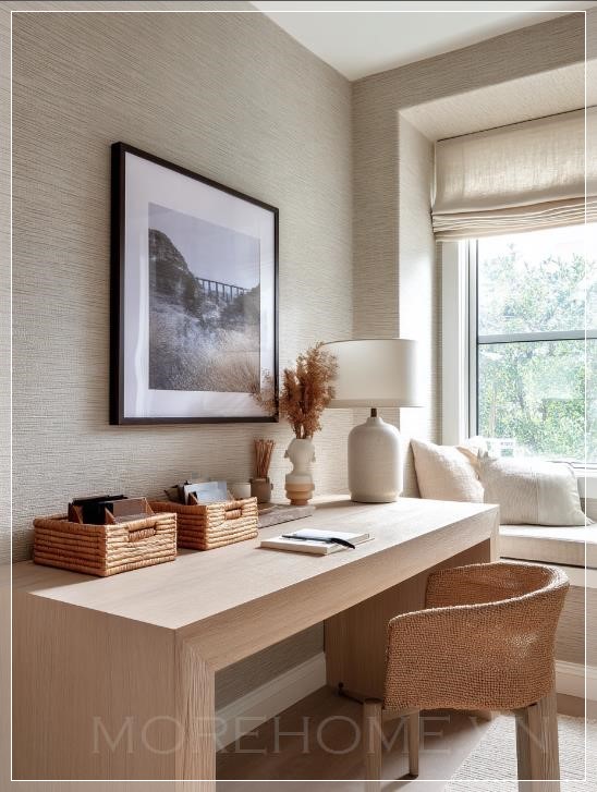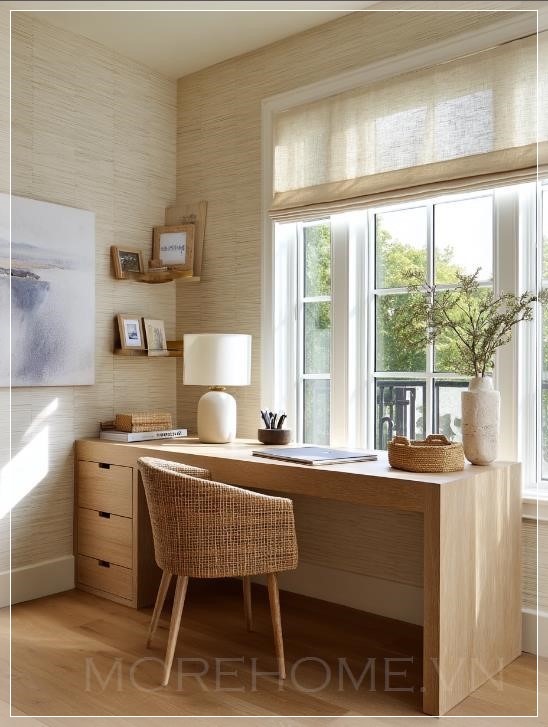 Ánh sáng mềm mại từ những chiếc rèm cuốn vải lanh tạo nên một bầu không khí thư giãn, trong khi các chi tiết trang trí tinh tế như khay tài liệu mây và bức tranh nghệ thuật thủ công với mép xé đẹp mắt thêm phần thú vị cho không gian này. Những món đồ gốm sứ với lớp men crackle tự nhiên mang lại vẻ đẹp nhẹ nhàng, độc đáo, hòa quyện cùng với sự thô mộc của không gian.