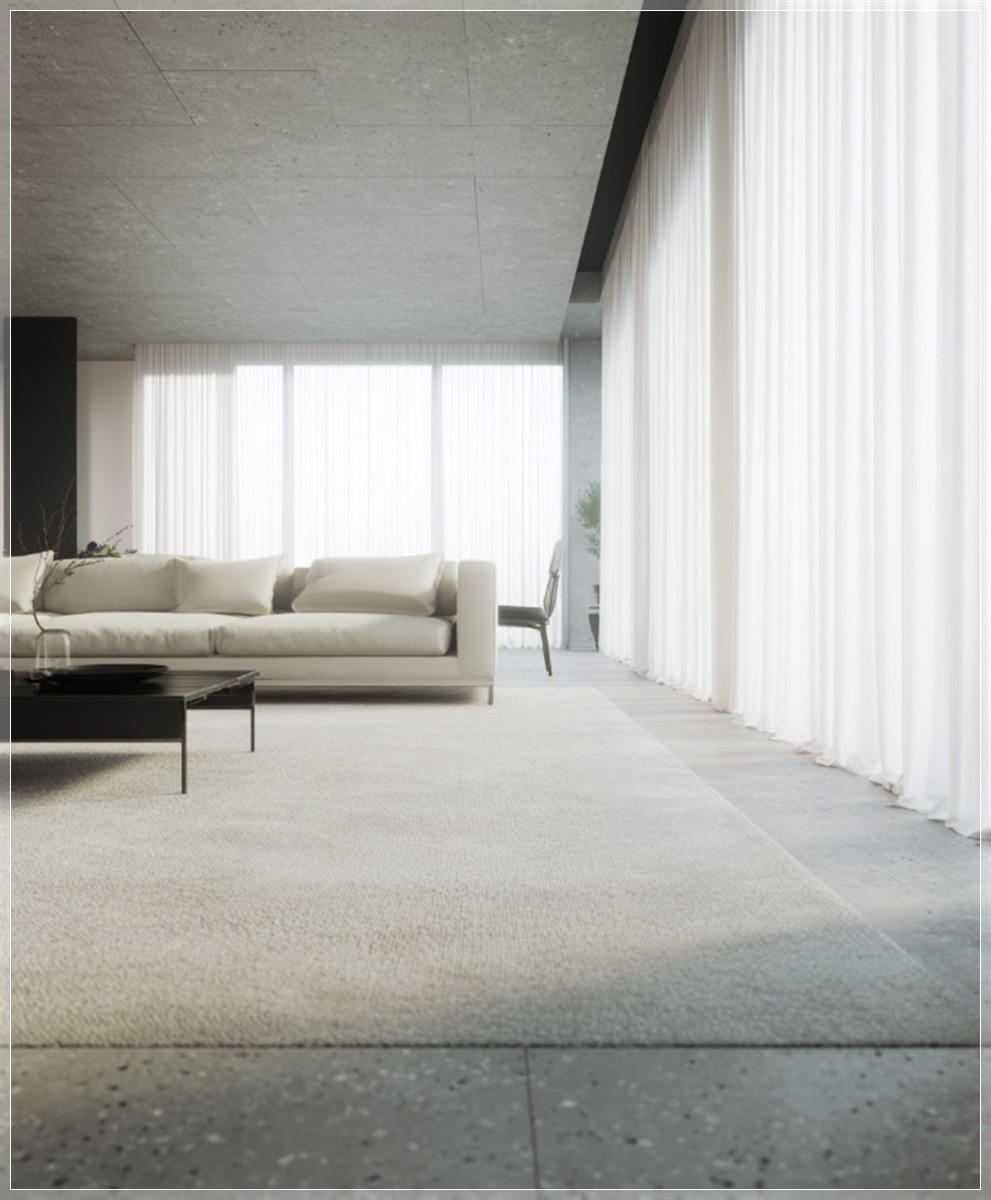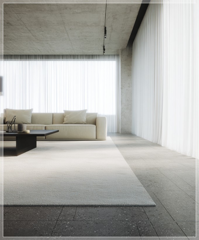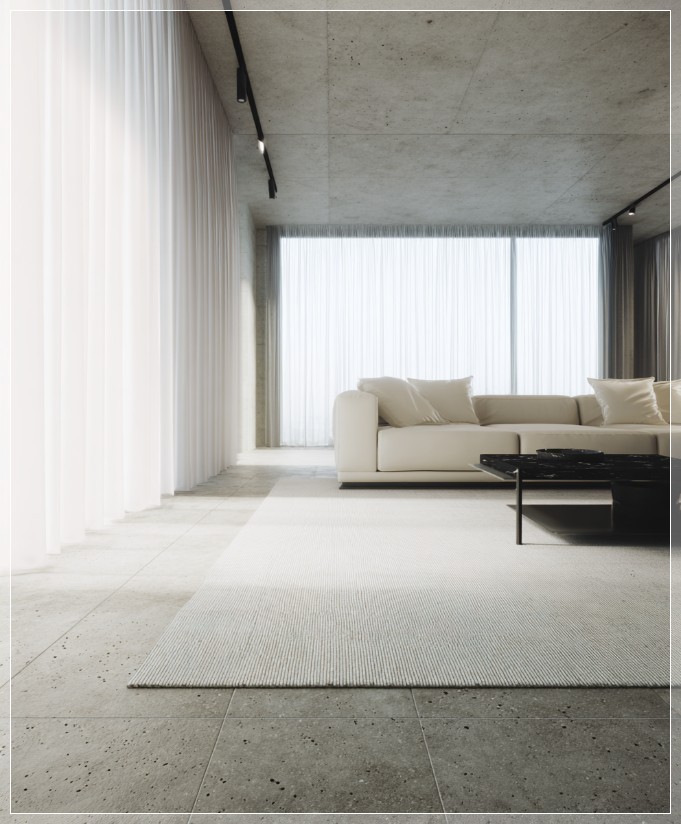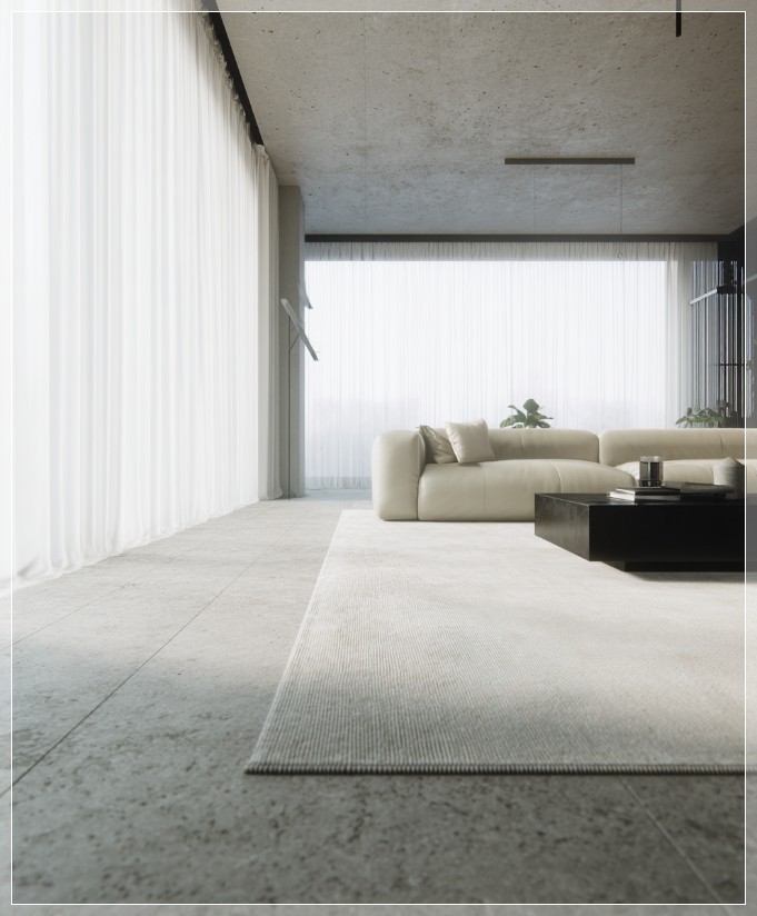 Chất liệu bê tông trong thiết kế lần này mang đến một cá tính khác biệt. Thay vì cảm giác thô ráp hay lạnh lẽo thường thấy, bê tông ở đây được xử lý khéo léo với bề mặt mịn, màu sắc dịu và hòa quyện vào tổng thể. Tường, sàn hoặc các bệ ngồi tích hợp từ bê tông trở thành phần nền vững chắc giúp làm nổi bật các vật dụng nội thất xung quanh. Khi kết hợp cùng đèn chiếu sáng âm trần, ánh sáng hắt nhẹ lên bề mặt bê tông tạo ra một bầu không khí rất yên bình, đúng tinh thần mà một phòng khách gia đình cần có.